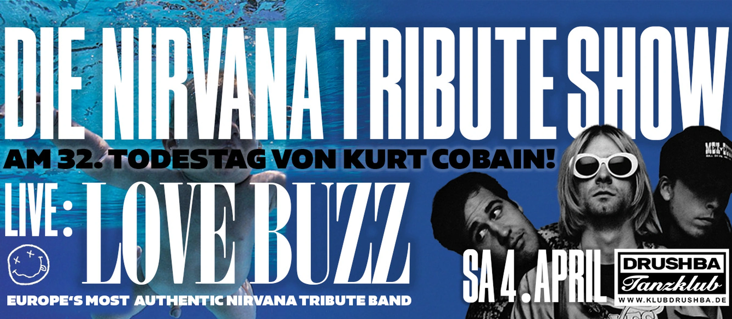Am 4. April 2026 erwecken LOVE BUZZ, eine der mitreißendsten Nirvana-Tribute-Bands Europas, die rohe Energie, Wut und Melancholie von Nirvana zu neuem Leben. Mit einem authentischen Sound, der Gänsehaut garantiert, feiern wir an diesem besonderen Abend das Erbe von Kurt Cobain, dessen Todestag sich zum 34. Mal jährt.