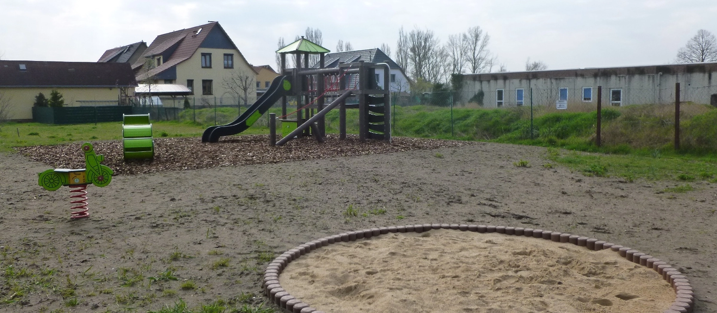 Sandkasten, Klettergerät, Turmkombination mit Rutsche, Federgerät, Bank, Müllbehälter