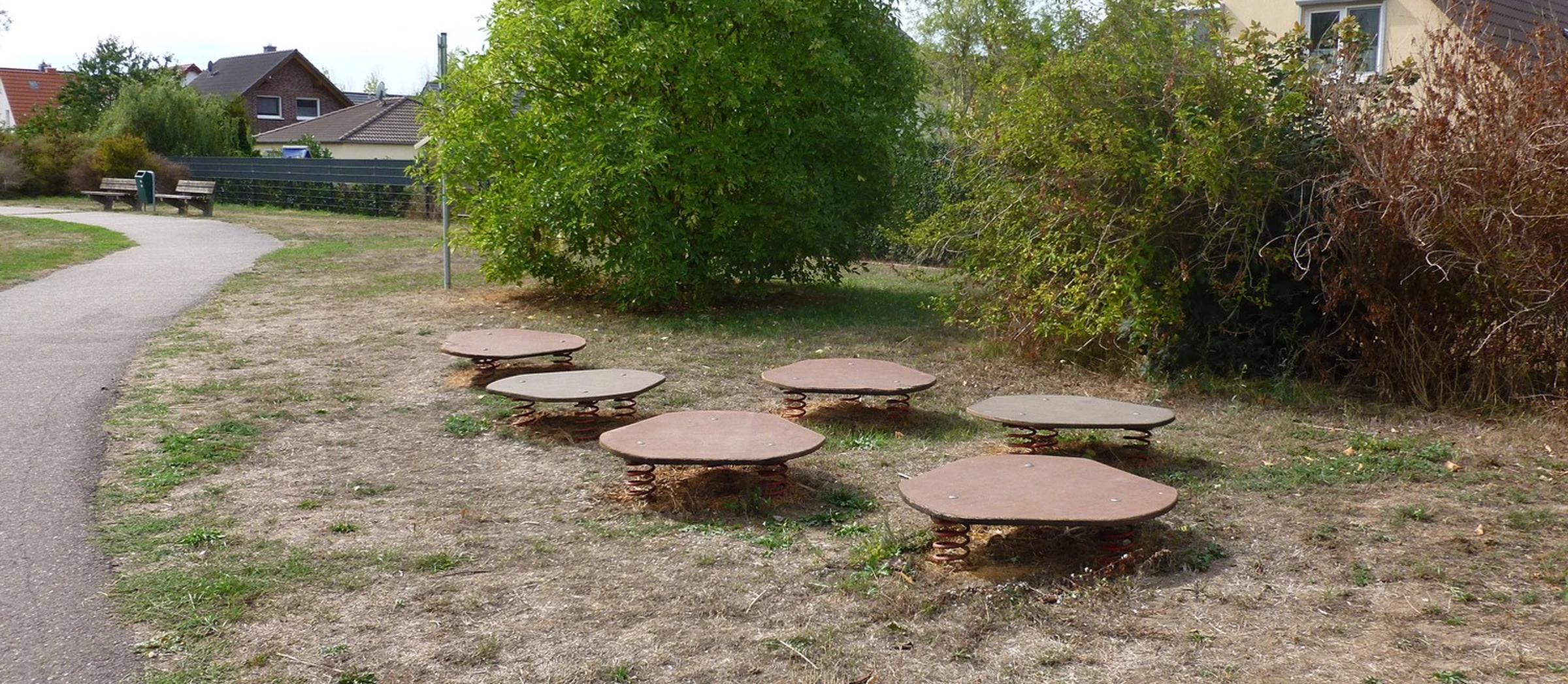 6 Hüpfplatten, Viersitz-Federgerät, 2 Einsitz-Federgeräte, 3 Bänke, 2 Müllbehälter